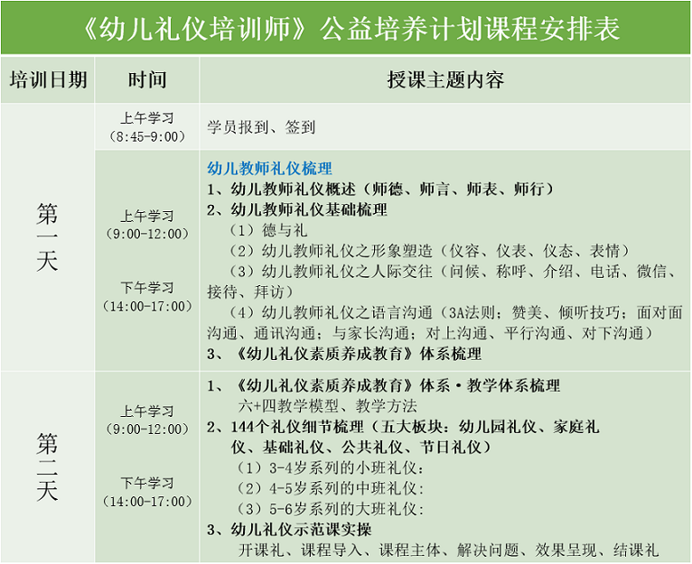 禮儀作為內(nèi)在的品德、品質(zhì)、修養(yǎng)的承載體和言行舉止、待人接物、與人交往溝通具體行為表達,是成長至關(guān)重要的素質(zhì),也是好家風(fēng)家教的成果展現(xiàn),更是社會文明程度的體現(xiàn)。為了解決幼兒禮儀培訓(xùn)師資緊張的問題,幫助幼兒禮儀教育工作者掌握禮儀訓(xùn)練內(nèi)容和教學(xué)規(guī)范、增強實際應(yīng)用授課能力、提高師資水平,建立幼兒禮儀授課專業(yè)教師隊伍,增強禮儀實際應(yīng)用及教育成果轉(zhuǎn)化,廣州市禮儀協(xié)會、研禮教育、廣州市德禮教育將于2022年11月19日—20日在廣州開展《幼兒禮儀培訓(xùn)師》公益培養(yǎng)計劃。詳情如下: